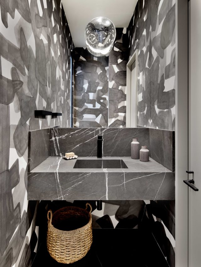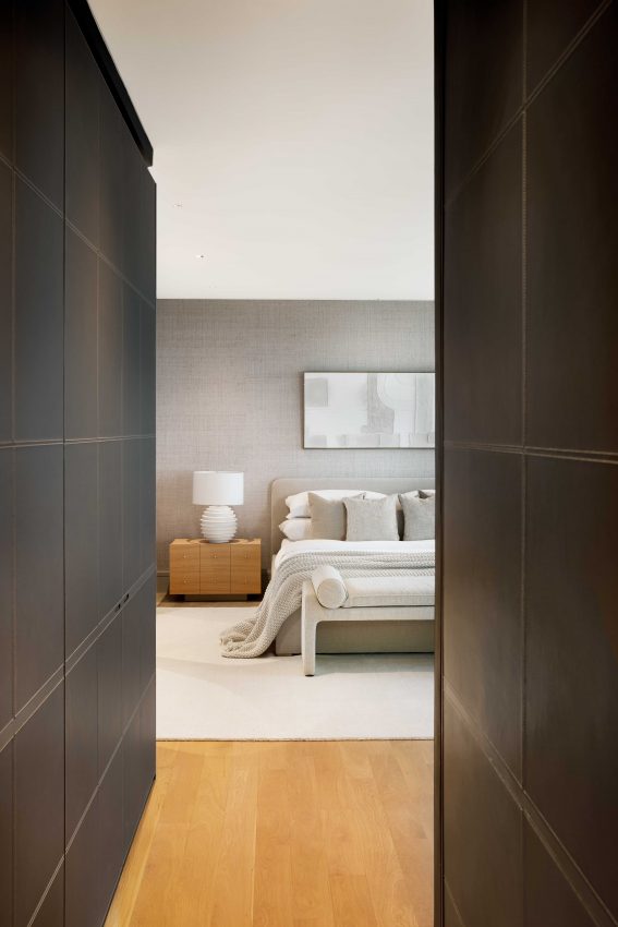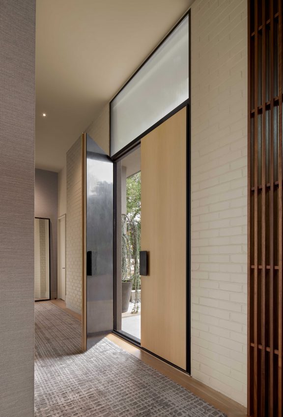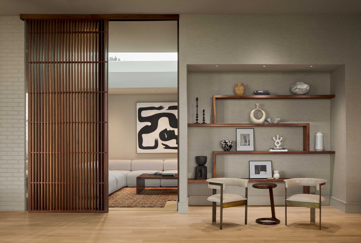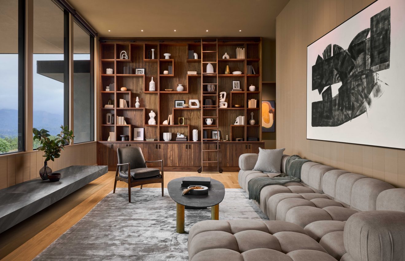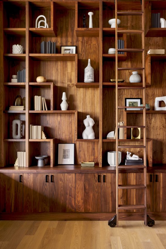 The home is a study in tactile materiality and collaboration. A massive, custom-fabricated pivot door anchors the entry, immediately establishing a visual axis through the home to the hills beyond. Inside, the spaces are defined by a rich, organic palette that balances modern precision with warmth. The living area features a sculptural stone fireplace and floor-to-ceiling glass that invites the tree canopy inside, while a monumental custom wood shelving system—crafted by John Dufficy—serves as both a functional library and a display for the client’s art collection.