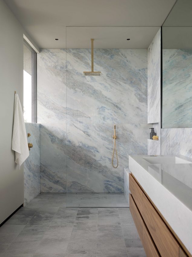 In collaboration with Barrow and Fourth, the interiors were curated to feel both gallery-like and deeply grounded. Features such as the monolithic stone dining table and geometric glass pendants sit beneath skylights that wash the space in natural light. The result is a home that feels simultaneously expansive and intimate—a “modern vernacular” retreat that honors the craft of building and the majesty of its setting.