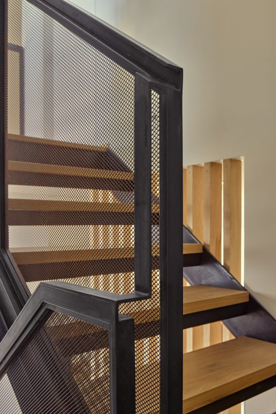 Their new home, with a view of the port, showcases aspects of early 20th-century industrial architecture with high ceilings, internal overlooks, floor-to-ceiling windows, and exposed beams and steel ties. The home is flooded with natural light from various directions during the day, and strategically placed lighting fixtures cast playful shadows at night.